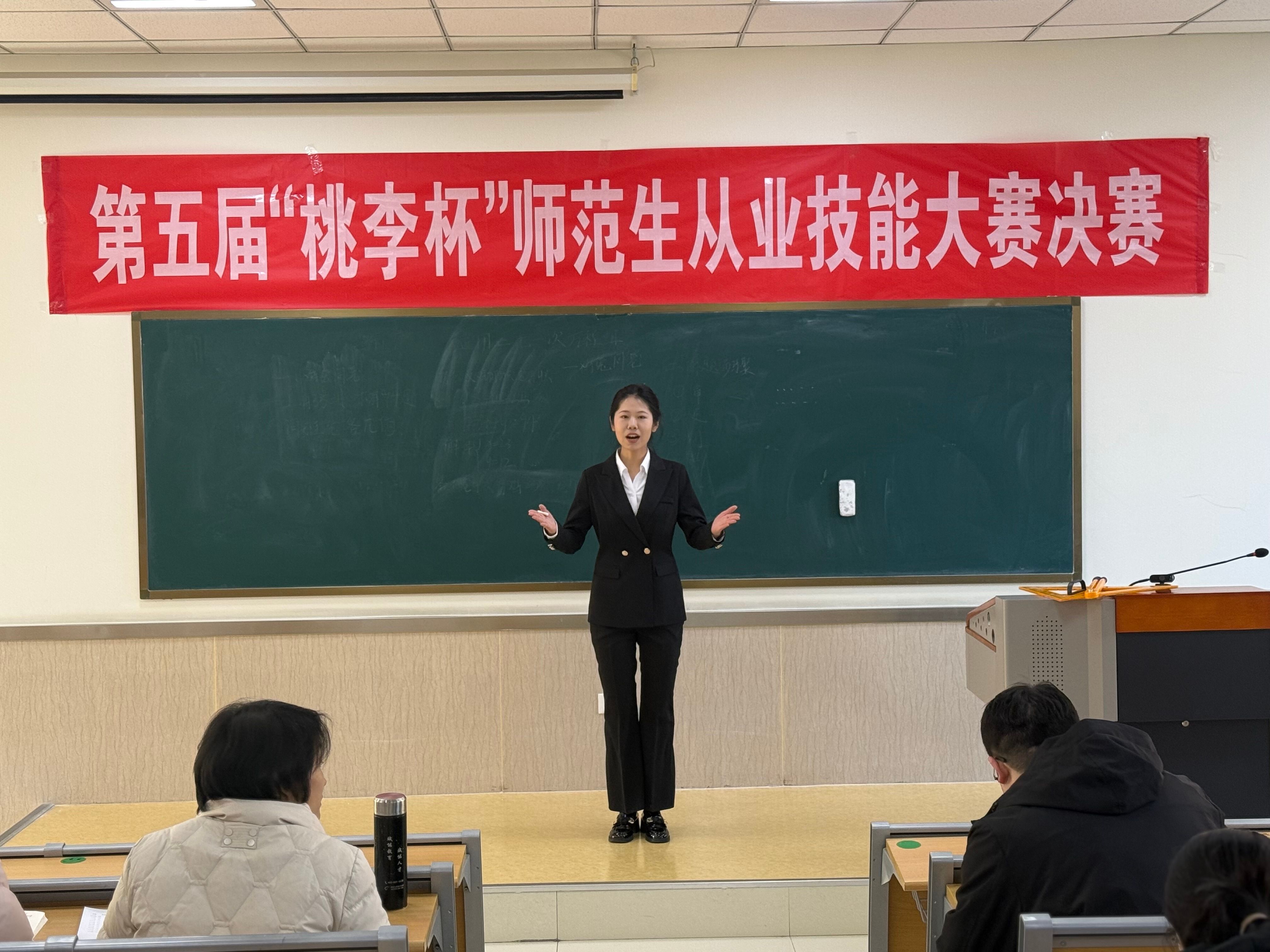 12月25日,大赛决赛在8B202、203等教室隆重举行。比赛形式以模拟上课为核心,要求选手在获取课题后,仅用1小时完成教学设计,随后进行10分钟的模拟课堂展示。为回归教学本质、锤炼板书功底,大赛明确规定模拟上课以黑板板书为主,重点考察选手对新课程教学理念的践行能力、课堂驾驭艺术、创新思维及教学研究素养。经过激烈角逐,初、高中组别分别产生一等奖、二等奖、三等奖若干。进入决赛及获得初赛一等奖的同学,将成为2025年山东省师范生从业技能大赛的优先推荐人选,并在后续各类技能竞赛中获得重点培养机会,为师范生搭建起“校级练兵—省级参赛”的成长阶梯。