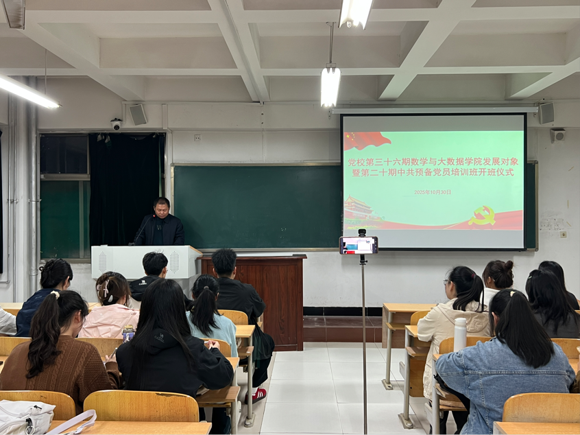 10月30日,数学与大数据学院在8A301教室成功举行“党校第三十六期数学与大数据学院发展对象暨第二十期中共预备党员培训班”开班仪式。学院组织员赵磊主持,党委副书记张长茂出席。30多余发展对象、中共预备党员与中共党员参与学习。