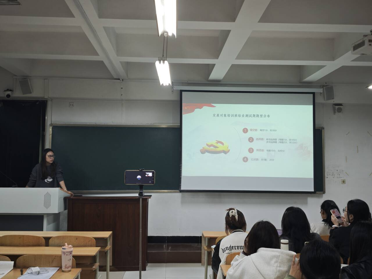 培训中,曹诚诚聚焦入党相关考核的核心内容展开讲解。她首先从考核的流程规范、分值构成入手,帮助在场同学们明确学习方向;随后围绕党的创新理论、党员的义务与权利、党内组织生活等重点模块,结合典型案例拆解知识点,并通过“问答互动+要点速记”的形式强化理解。