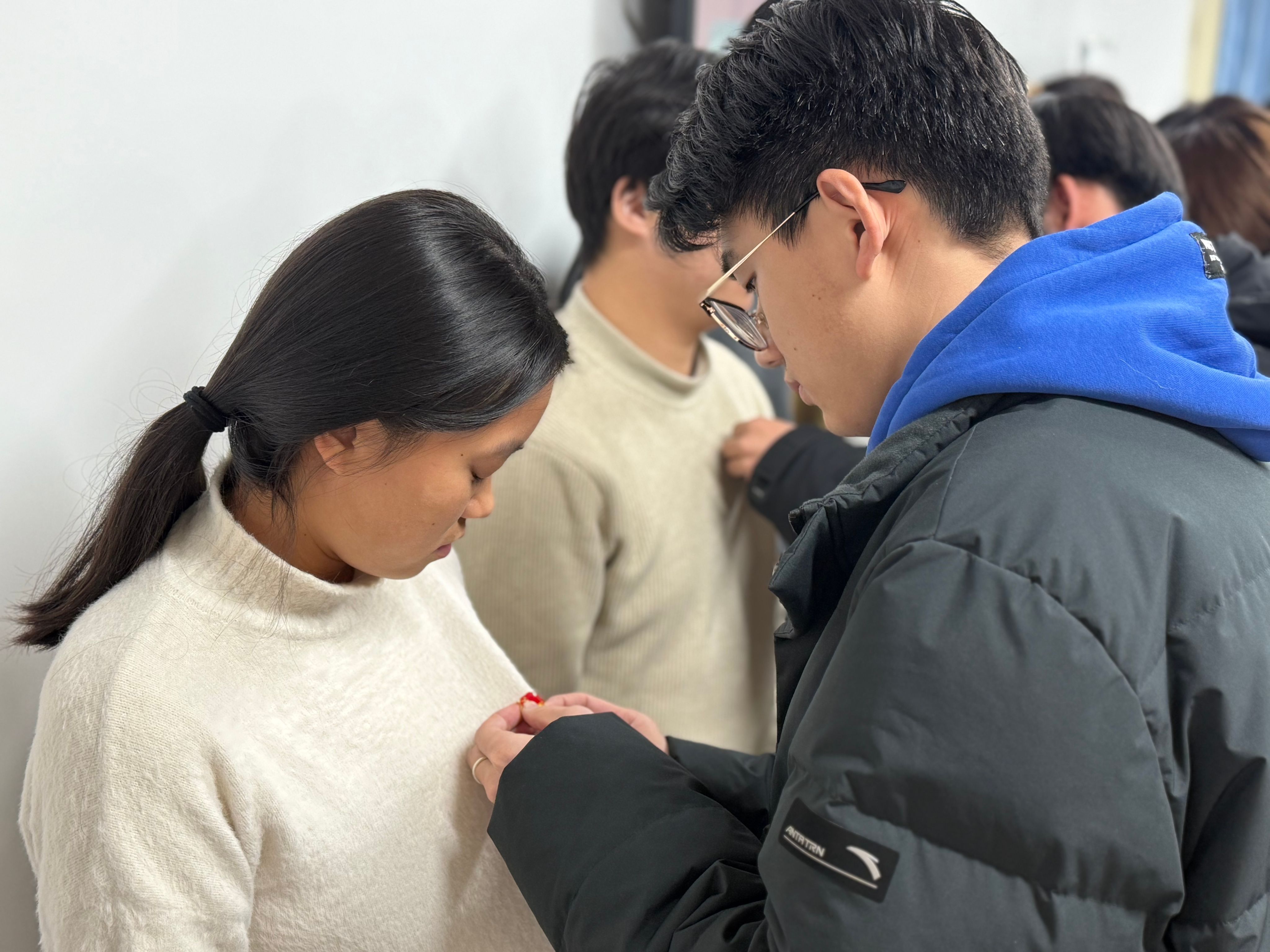 随后,老团员代表们手持熠熠生辉的团徽,郑重地为新发展团员佩戴在胸前。当金色的团徽映衬着新团员们年轻的脸庞,一份沉甸甸的责任与使命也随之传递。接着,全体新发展团员面向鲜艳的团旗,高举右拳,庄严宣誓,既是新团员对共青团组织的郑重承诺,更是他们矢志不渝跟党走、勇担时代使命的坚定决心。大会在《中国共产主义青年团团歌》中落下帷幕。