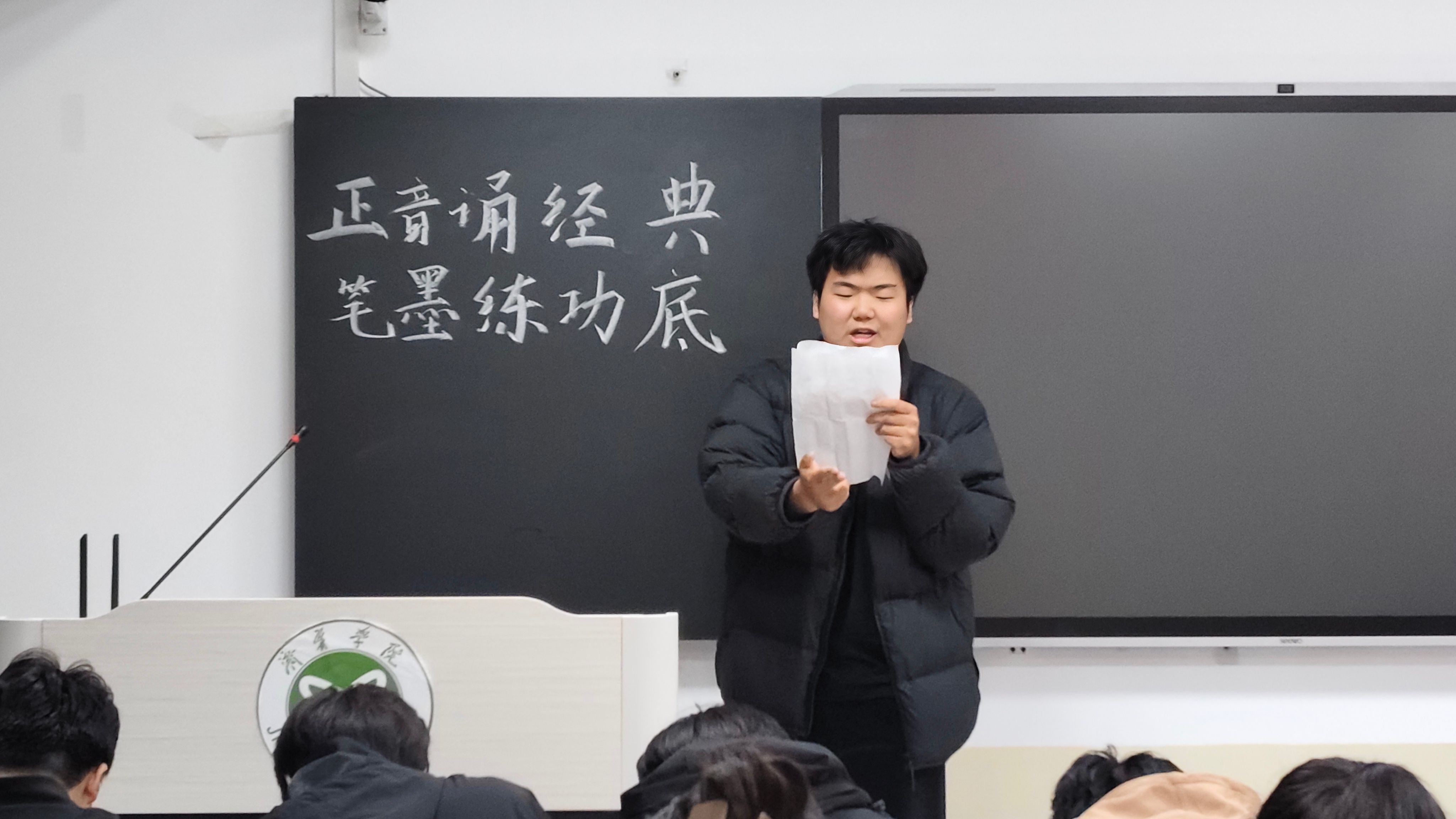 3月25日晚,数学与大数据学院在9A110教室,顺利开展桃李杯师范生从业技能提升活动之“正音诵经典 笔墨练功底”主题活动,30余名同学参加。