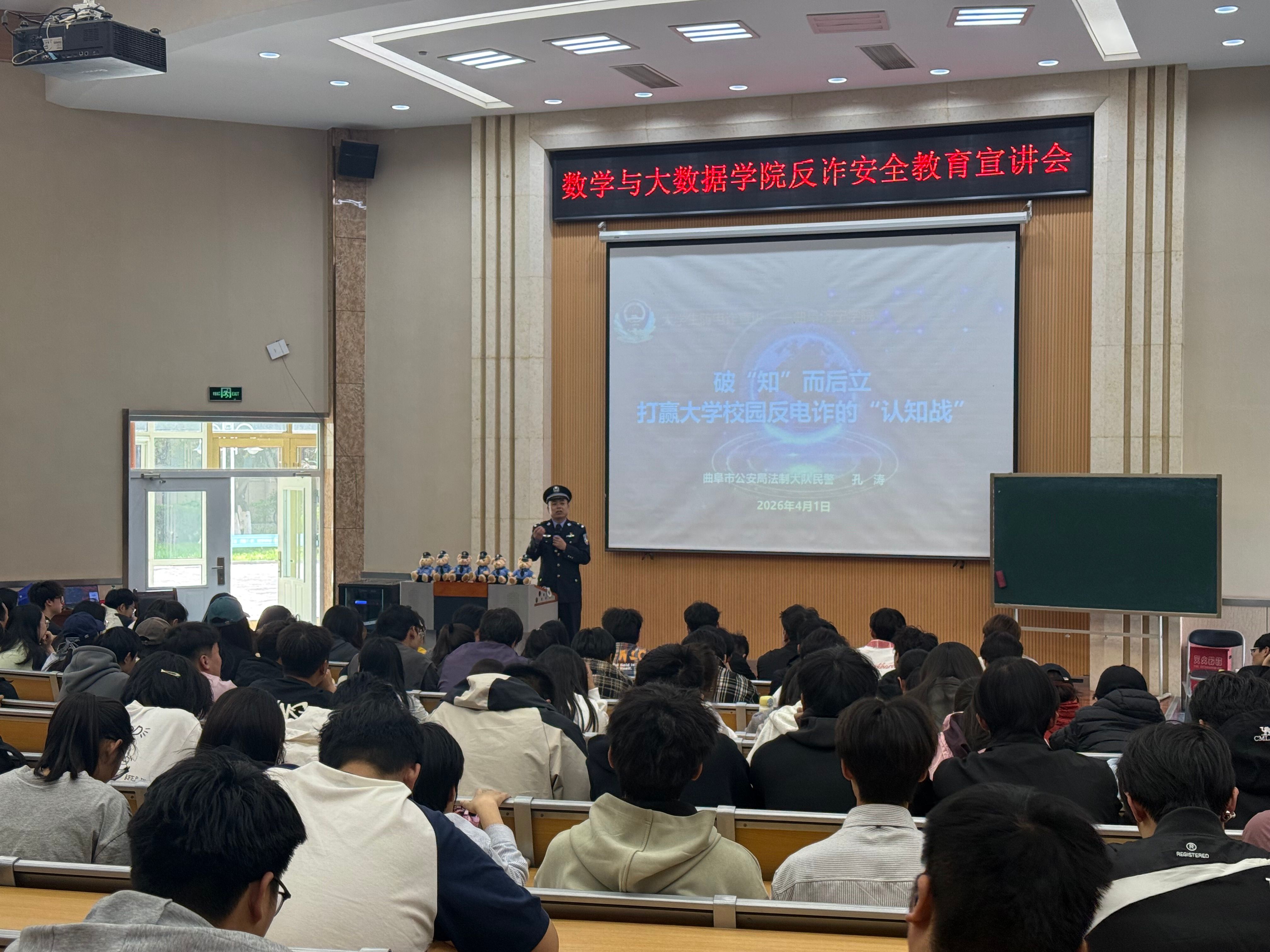 为切实提升全院师生防范电信网络诈骗的意识和能力,筑牢校园安全防线,扎实推进“无诈校园”建设,4月2日下午,数学与大数据学院特邀曲阜公安局法制大队中队长孔涛警官,开展《破知而后立——打赢大学校园反电诈的认知战》反诈专题安全教育宣讲。学院400余名师生代表齐聚现场,认真聆听讲座,共同学习反诈知识、提升防骗本领。