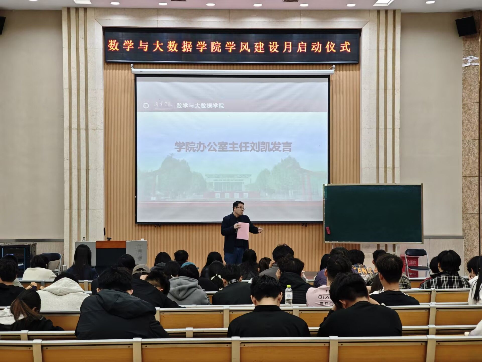 为深入推进学风建设,营造优良育人环境,4月2日下午,数学与大数据学院2026年学风建设月启动仪式在8号楼B103顺利举行。学院办公室主任、优秀班主任代表刘凯、教学秘书张壮壮、教师代表曹敬青、姚丽娜以及全体辅导员出席,2024、2025级全体学生参加。仪式由学院团委书记陈轶洋主持。
